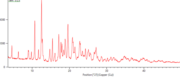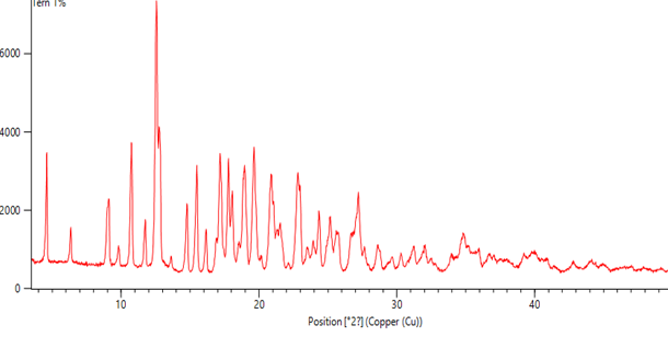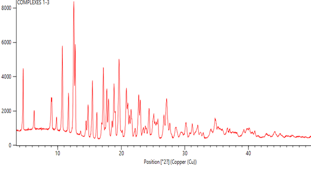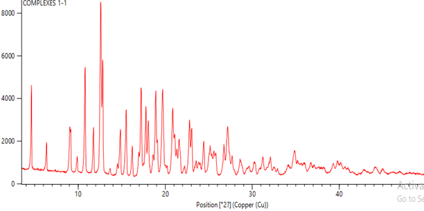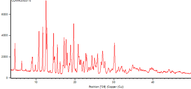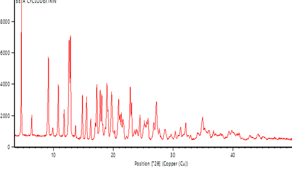 This study was performed at PW1710 X-ray diffractometer with Cu as anode material and graphite monochromator, operated at a voltage of 35kV, current 40 mA in the 2θ angle range of 10-70 °C with scan time of 0.5s. The X-ray diffractogram showed narrow and broad peaks reflecting the nature of drugs, excipients and complexes [35].