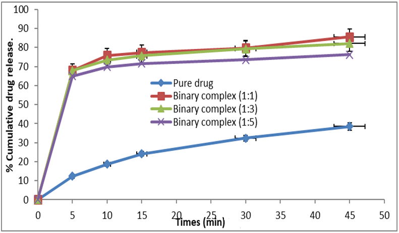Fig. 5: Comparative % CDR of pure drug and binary complexes, (n=3 with mean±SD)