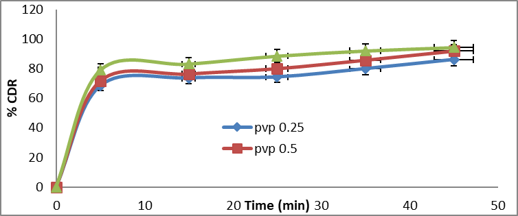Fig. 9: % CDR of ternary complexes with different concentration of PVP K-30, (n=3 with mean±SD)