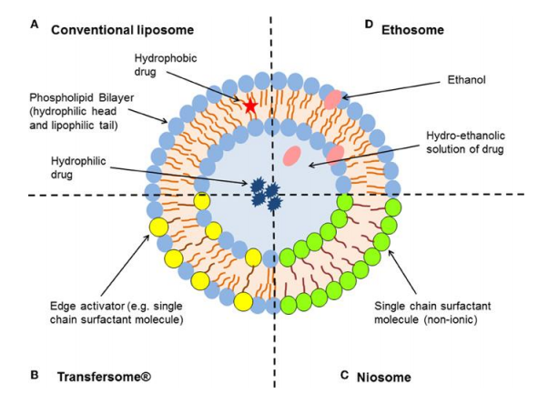 It is a liposomal vesicle that is neutrally charged which are capable of deliver both the hydrophilic and lipophilic drugs over deeper layers of epidermis and exhibits its action [7]. They are Great potential carriers for the transdermal skin delivery. It is composed of small amounts of ethanol, terpene or terpene mixtures (1-5%) and Phosphotidyl choline as depicted in fig. 5(C) with increased concentration of terpene in the composition the vesicle size and membrane elasticity increases [8, 24].