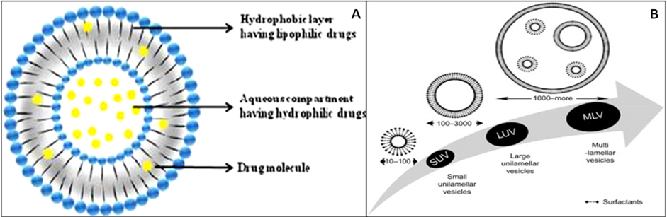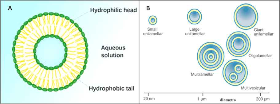 Fig. 3: (A) Structure of liposome; (B) Liposomes types based on size [21, 28, 38, 39, 51]