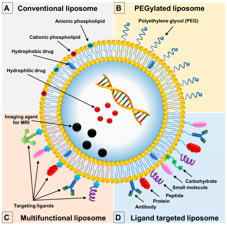 Fig. 4: Structure and components of various types of liposomes [21, 28, 38, 39, 51]