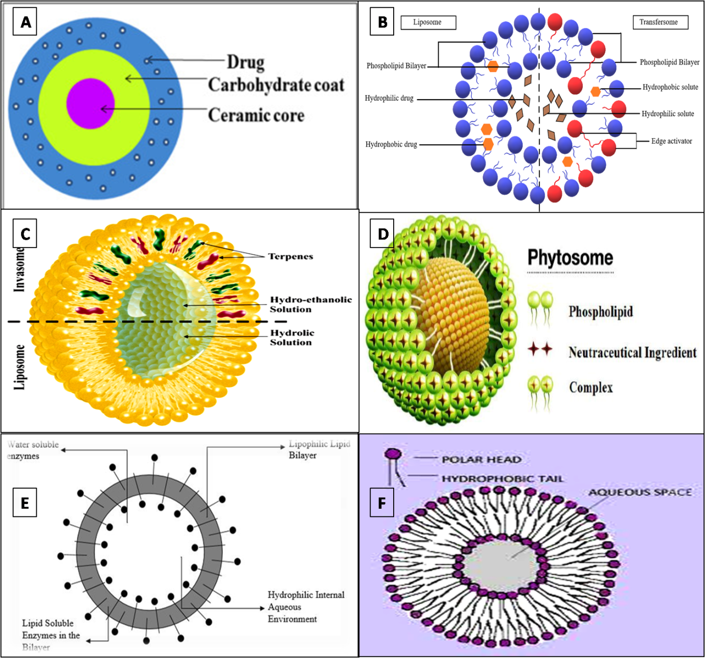 Fig. 5: (A) Structure of aquasome [53, 46]; (B) Structure of Transferosome and it comparison with liposome [51, 60]; (C) Structure of Invasome and it comparison with liposome [8, 24]; (D)Structure of Phytosomes [9, 22, 26]; (e) Structure of Enzymosomes [11]; (F) Structure of sphingosomes [12, 29]