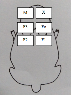 Fig. 1: Illustration of the location of tonic formula hair tonic on rabbit, Explanation-M: Positive Control, X: Without Treatment, F0: Negative Control (Blank), F1: Clove Leaf Extract 5%, F2: Clove Leaf Extract 10%, F3: Clove Leaf Extract 15%