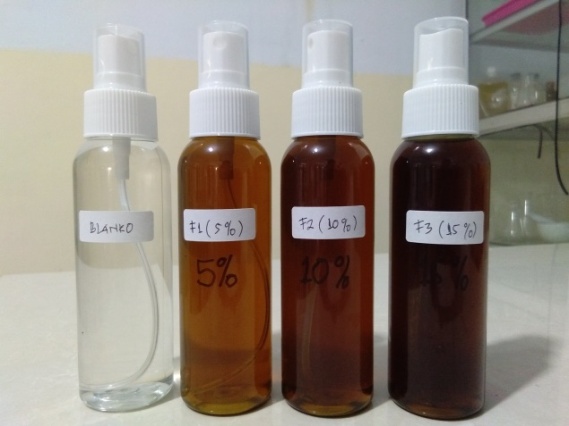 Hair tonic with the addition of clove leaf extract, each 5% light brown, 10% dark brown, and 15% blackish brown. Clove hair tonic preparations of clove leaves have a distinctive clove odor. Hair tonic F0 (blank) is transparent (clear) and has a distinctive smell of menthol. The formulated hair tonic can be seen in fig. 2.