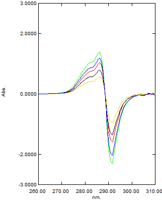 Fig. 1: Overlay first derivative ratio spectra of DEX at 277.0 nm (DOX 430 µg/ml+DOX 430 µg/ml used as double divisor)