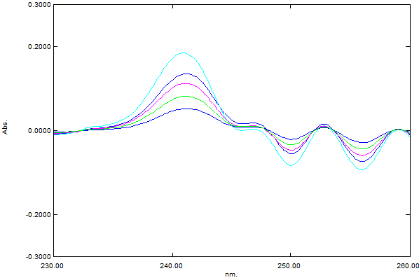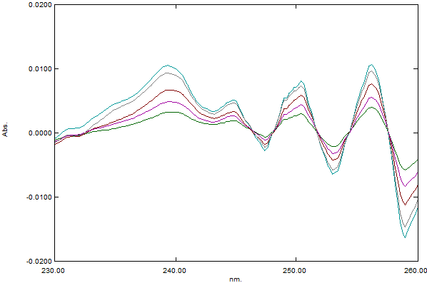 Fig. 2: Overlay first derivative ratio spectra of DOX at 243.0 nm (DEX 430 µg/ml+PSE 430 µg/ml used as double divisor)