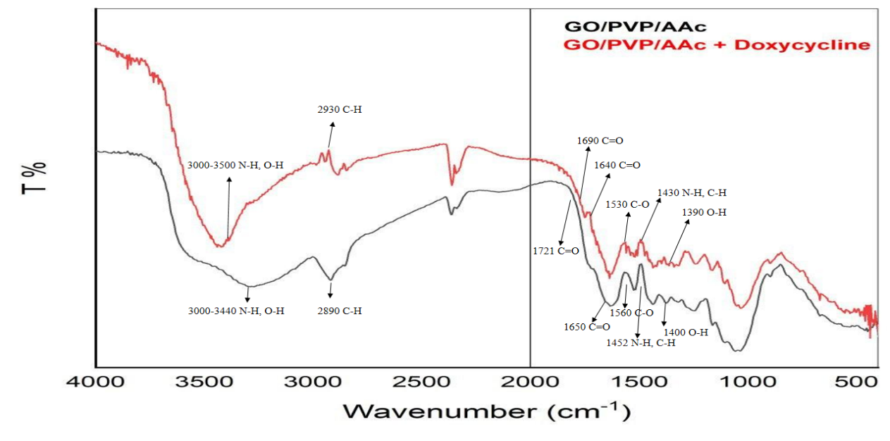 Fig. 1: The surface of GO/ (PVP/AAc) composite before and after doxycycline adsorption using Fourier transform infrared spectroscopy.