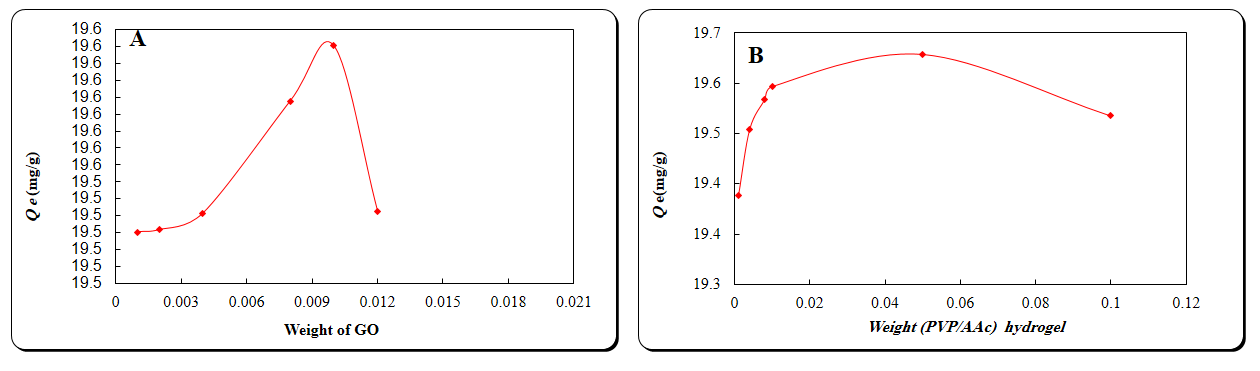 Different weights (0.01-0.12 g) of GO were used for determination the best weight for evaluation the equilibrium uptake capacity (Q e) of D. The fig. 3A show a rise in the quantity of the adsorbent when the amount of GO rise and reaching equilibrium at 0.01 g, so using this concentration for the subsequent studies. In the same manner many weights of (PVP-AAc) (0.01-0.15 g) were used for choosing the best weight for further studies, and from fig. 3B show the best weight equal to 0.05 [15, 21].