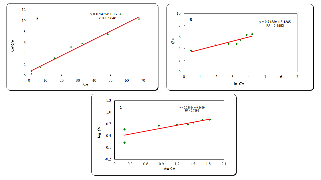Fig. 5: Langmuir (A), Freundlich (B), and Temkin (C) isotherms of doxycycline adsorption on the GO/(PVP/AAc) composite hydrogel