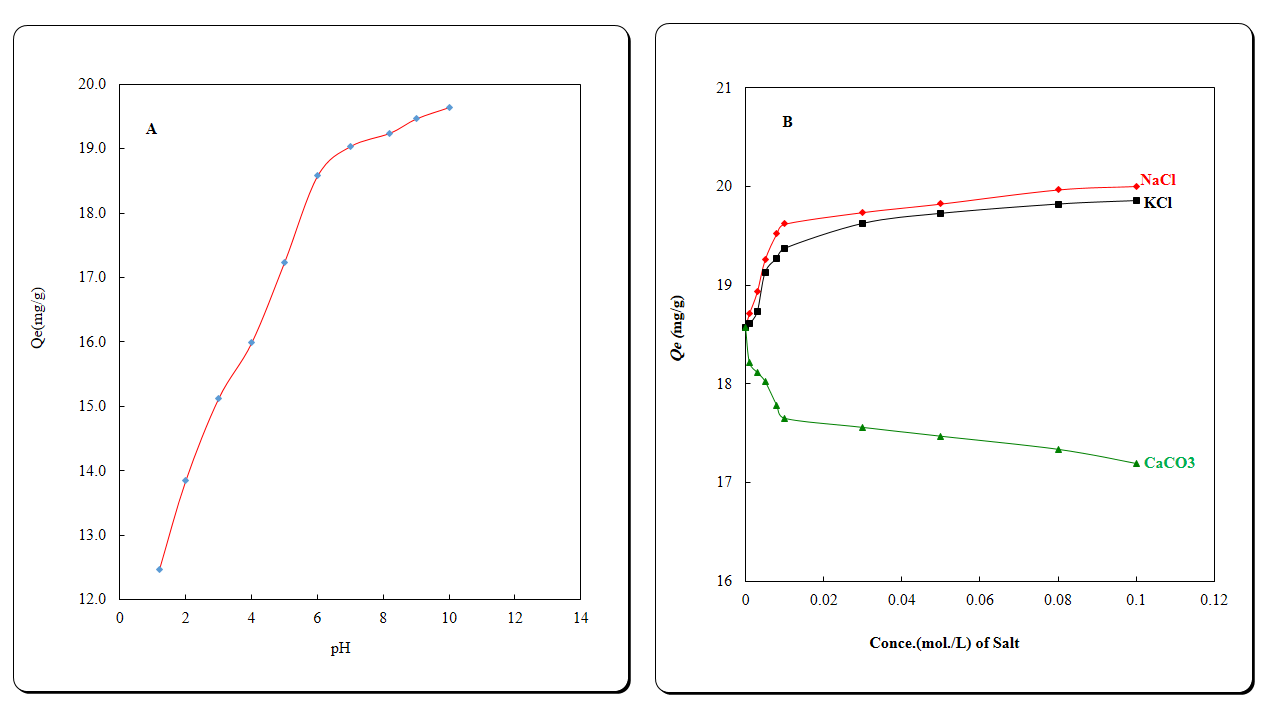 Fig. 8: pH effect (A) and ionic strength effects (B) of NaCl, KCl and CaCO3 on the adsorption capacity of D on GO/(PVP-AAC) surface composite