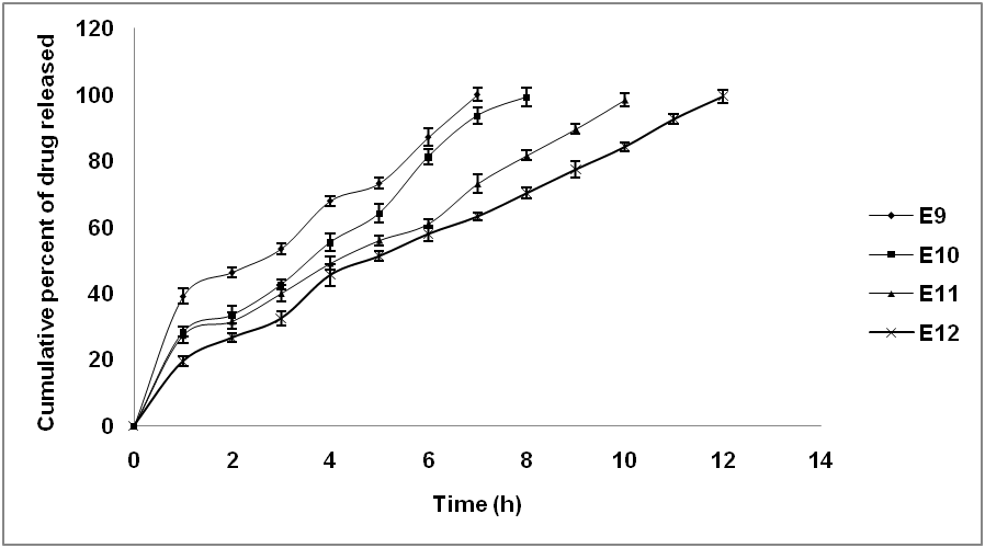 The drug release from various formulations was shown in fig. 3, 4, 5 and the drug release characteristics are shown in table 3. The drug release profiles showed different values; the formulations prepared with varied concentrations Eudragit L 100 i.e. E9, E10, E11 and E12 showed percent drug release of 100.01±2.04, 99.21±2.73, 98.41±2.04, 99.53±1.98 at the end of 7th, 8th, 10th and 12th hour respectively. Based on the above release pattern the E12 the formulation prepared with 2 % of Eudragit L 100 showed a release pattern according to the prescribed limits.