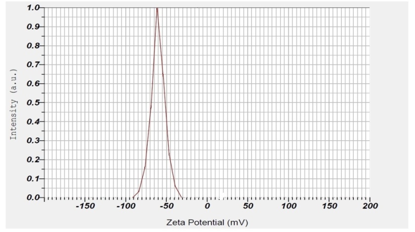 Zeta potential is a measure of the charge on the electrical double layer of the nanoparticle, which indicates the various stability concerns. Zeta potential measurements have been conducted at a temperature of 25 °C along with an electric field strength of 23 V/m, using Zetasizer (Malvern).
