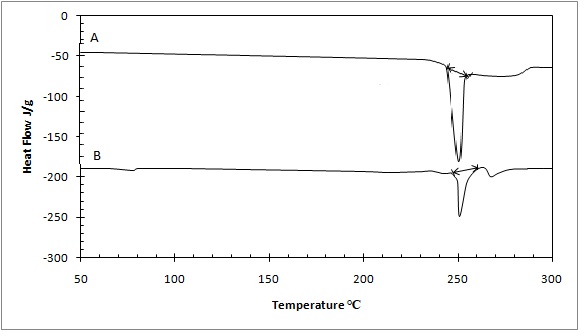 Fig. 7: DSC Thermogram of Eprosartan and along with excipients, *A = Pure Eprosartan, B = combination of Eprosartan along with excipients