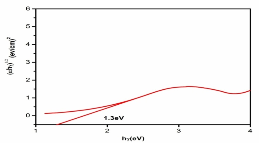Where α, I, h, γ and Eg are linear absorption coefficient, proportionality constant, Planck’s constant, photon frequency and optical energy band gap. The optical energy of the band gap can be evaluated by plotting (αhν)2, (αhν)1/2 and photon frequency will be made (fig. 3 and 4). The energy of band gap for Zn-Fe3O4Nps was found to be 1.9ev (direct band gap) and 1.3eV (indirect band gap), which is smaller than bulk Fe3O4NPs [18]. The outcome confirmed that zinc metal ion plays a significant role to reduce the energy band gap of the magnetite nanoparticles.