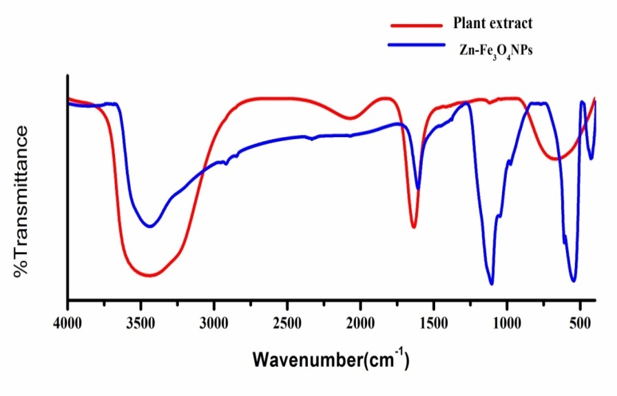FTIR spectra were studied to analyze the bioactive functional groups of Andrographis paniculata, which acted as a reducer, capping and stabilizing agent in the preparation of Zn-Fe3O4Nps. The spectrum of the Andrographis paniculata indicated a high intense absorption peak at 3436,2071,1634,1119,666 cm-1, whereas the intense absorption peaks of synthesized Zn-Fe3O4Nps were indicated at 3446, 2340, 1615,1111,616, 552 and 435 cm-1(fig. 5). The absorption band at 3446 cm-1 in the Andrographis paniculata extract was attributed to the O-H stretches [19], while absorption peak at 1634 cm-1 and 1119 cm-1 were contributed to C=0 stretches [20] and C-O-C stretches, respectively. All the bands were shifted, indicating the bioactive group involvement and interactions of NPs with the Andrographis paniculata extract, presence of bioactive compounds on the surface of Zn-Fe3O4Nps has an influence on the FTIR peaks. Two strong absorption peaks were found at 552 cm-1 and 435 cm-1 in the spectrum of synthesized nanoparticles, which is related to the Fe-O stretching vibration mode of magnetite (Fe3O4). The absorption peak at 552 cm-1 can be contributed to the intrinsic stretching vibration of metal at the tetrahedral site, whereas the peak found at 435 cm-1 is corresponds to octahedral stretches of Fe-O [21]. The weak absorption band at 616 cm-1 is associated with Zn-O stretching vibration [22]. The above information confirms the formation of Zn-Fe3O4NPs. Based on FTIR, the bioactive compounds found in the Andrographis paniculata extract strongly suggested the conformation of alkaloids, terpenoids, flavonoids, saponins, phlorotannins, phenols and tannins. These bioactive compounds acted as a reducer and efficient stabilizing agent for Zn-Fe3O4NPs in the solution.