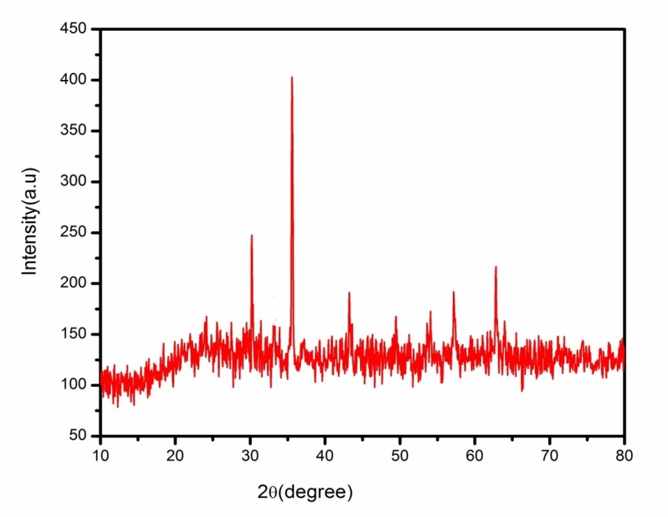 values of 30.27, 35.60, 43.23, 53.87, 57.23, 62.78 degrees corresponding to the crystal planes at (2 2 0), (311), (400), (422), (511), (440) respectively. All these diffraction peaks clearly coincide with the diffractions of iron oxide nanoparticles (magnetite phase). No other secondary phase is detected to prove the formation of other zinc-based structures such as simonkolleite, hydroxyzine, etc. So, we might conclude that Fe3O4 NPs has been formed with high phase crystalline purity and Fe ions have successfully replaced by zinc ions. Furthermore, this XRD spectral pattern is well-matched with early reported zinc metal-doped iron oxide nanoparticles [23]. The XRD spectral pattern is matched with pure cubic magnetite nanoparticles with the Join Committee of Powder Diffraction Standards (JCPDS File no 01-074-1910).