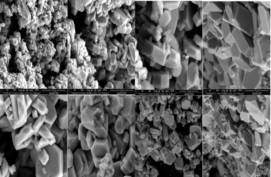 The powder sample was analyzed for the morphological character of the Zinc doped magnetite nanoparticles by using SEM at different magnifications, including 2 µm, 5 µm and 10µ. The SEM images of zinc doped magnetite nanoparticles using Andrographis paniculata leaf extract are shown in fig. 7. SEM micrographs reveal that the surface morphology of the nanoparticles is cubic in shape [24]. The intense peak obtained from EDX spectra is Zn, Fe and O (fig. 8). The composition of zinc, iron and oxygen element is about 5.26, 35.71 and 52.18 % for Zn-Fe3O4 NPs. EDX spectra also detect the presence of C and S, which may originate from the biomolecules present in the Andrographis paniculata extract. Therefore elemental studies confirm that the synthesized nanoparticles are pure without any impurity peaks.