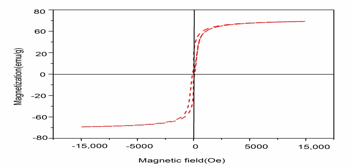 The magnetic behavior of zinc doped magnetite nanoparticles was evaluated by vibrating scanning magnetometer. The applied magnetic field was between-15,000 Oe to 15,000 Oe. The magnetization curve of the synthesized nanoparticles is depicted in fig. 9. The measured magnetic saturation value of Zn-Fe3O4 NPs is 70 emu/g at 300 k temperature, which is higher than that of bulk magnetite (Fe3O4) [25]. The obtained result reveals that the synthesized Zn-Fe3O4 nanoparticles are super paramagnetic (particle size 5 nm) at room temperature.