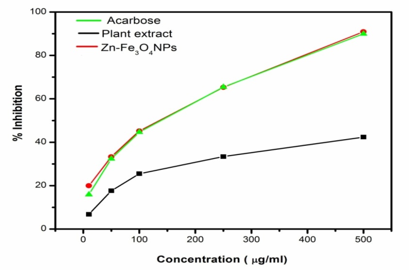 Diabetes mellitus is a major metabolic disease in which there are high blood sugar levels over an extended period. A medical approach to control hyperglycemia is to suppress the alpha-amylase enzyme. The carbohydrate digestive enzyme (α-amylase) is used for the conversion of carbohydrates into monosaccharides, which is the major reason for increasing of high blood sugar levels in the human body. Therefore, synthesizing compounds having strong inhibitory activities towards digestive enzymes is an easy route to cure diabetes [26]. The inhibitory activity of green synthesized Zn-Fe3O4 NPs in combination with commercially used pharmacological inhibitor, Acarbose, was examined. The results indicate that the digestive enzyme was significantly inhibited with various concentrations of Zn-Fe3O4 nanoparticles.