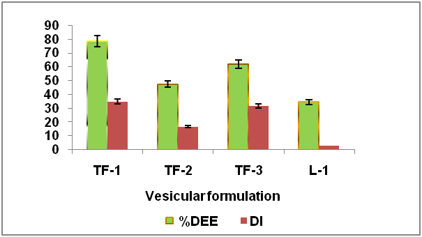Fig. 1: Comparative study of %DEE and DI on vesicular formulations (mean±SD, n=3)