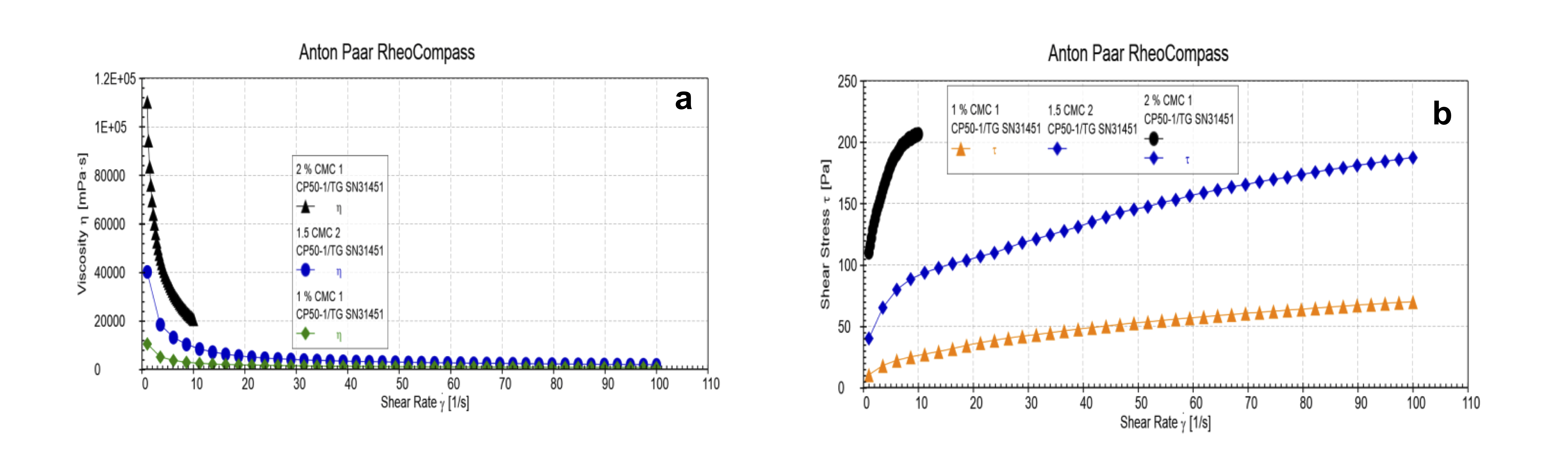 Fig. 3: Viscosity measurement; (a) Shear rate effect on the viscosity of various gel formulations and (b) Shear rate effect on the shear stress of various gel formulations