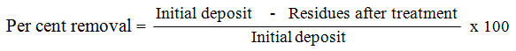 The sample collected at 0 d interval also used for decontamination studies for determining the effect of various processing techniques (Treatment-1 to T-12) on the level of removal or reduction in pesticide residue contents. The details of all the treatments were listed in table 1. After about 2 h of the spray, okra was harvested and packed in polyethylene bags and brought to the laboratory for further processing.