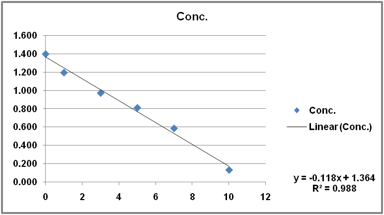 The initial deposit of Carbendazim in okra fruits grown in the field was 2.239 mg/kg with a half-life (t½) of 3.544 d. More than 98 % of this residue had dissipated after 15 d of spraying (table 4 and fig. 2). The various factors that may influence pesticide persistence are climate, physical and chemical properties of pesticide [6]. MRLs have not yet been set by FAO/WHO, US for carbendazim in okra. Maximum residue limits for carbendazim have been set in tomato in the range of 0.5 mg per kg and cucumber 0.05 mg per kg body weight.