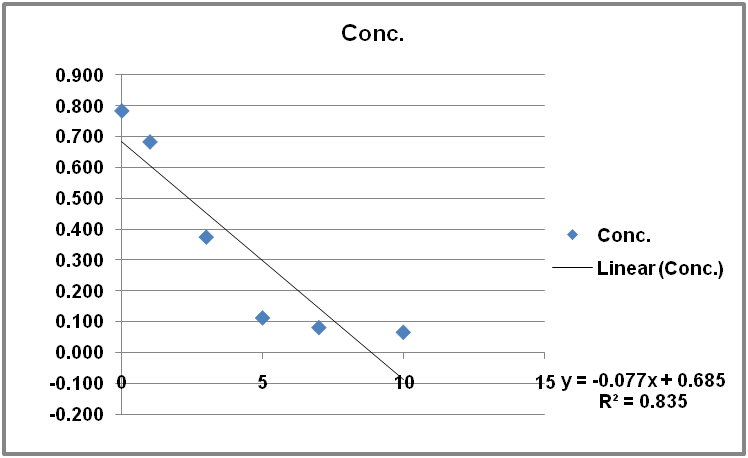 The initial deposit of quinalphos in okra fruits grown in the field was 0.78 mg/kg) with a half-life (t½) of 2.471 d. 100 % of this residue had dissipated after 15 d of spraying (table 8 and fig. 6). The various factors that may influence pesticide persistence are climate, physical and chemical properties of pesticide [6]. MRLs (maximum residue limits) have not yet been set by FAO/WHO, US [9] for quinalphos in okra.