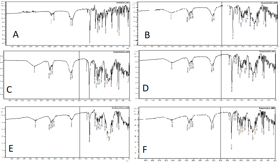 Fig.1: FTIR spectra of [A] LH [B] 1:1 physical mixture of LH and HPMC E-15 [C] (1:1:1) physical mixture LH HPMC E-15 and HPMC K-4M. [D] (1:1:1) physical mixture of LH,HPMC E-15 and HPMC E-5 [E] (1:1:1:1) physical mixture of LH, HPMC E-15, HPMC E-5 and HPMC E-3 [F] (1:1:1) physical mixture of LH, HPMC E-15 and HPMC E-3, (mean±SD; n=3)
