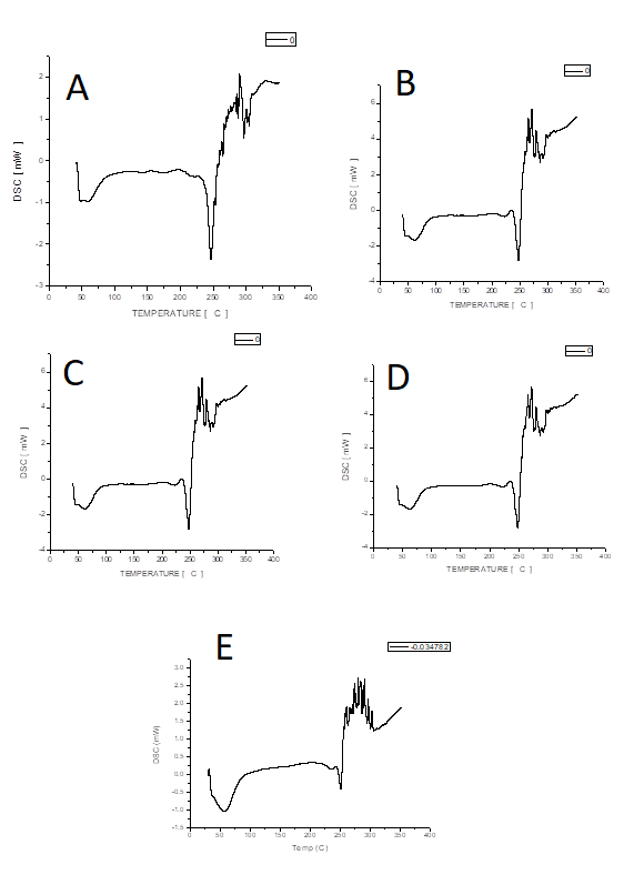 Fig.2: DSC spectra of [A] LH. [B]1:1 physical mixture of LH and HPMC E-3 [C]1:1 physical mixture of LH and HPMC E-5 [D]1:1 physical mixture of LH and HPMC E-15 [E] 1:1 physical mixture of LH and HPMC K4M. (mean±SD; n=3)