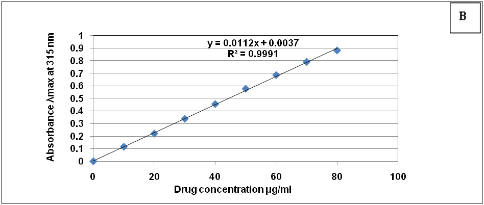The scanning of diluted solutions of LH in 0.1N HCl and pH 6.8 phosphate buffers was performed by using UV spectrophotometer from 200-400 nm. The maximum absorption value of LH was found at 315 nm in 0.1N HCl and 6.8 pH phosphate buffer. Therefore 315 nm were recorded as λmax of the pure drug LH. 315 nm λ max was selected for calibration curve and further experiment. The UV spectrum of LH and calibration curve in 0.1 N HCl and 6.8 phosphate buffer is depicted in fig. 3A and 3B, respectively.