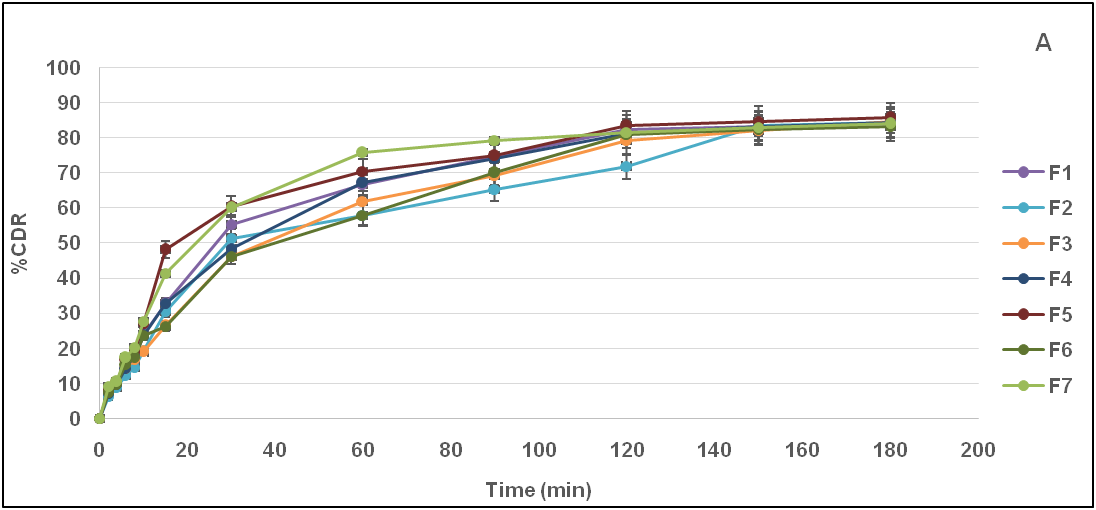 All formulations exhibited a similar pattern of drug release with a maximum of 55% in phosphate buffer pH 6.8 and 85% in 0.1 N HCl. The formulation F7 was found to havea faster release (30% and 40 % within 15 min in phosphate buffer pH 6.8 and 0.1N HCl, respectively) as compared to other formulations as seen in %CDR verses time plots in phosphate buffer pH 6.8 (fig.5A) and 0.1N HCl (fig.5B).Percentage drug release in recently reported studies on LH films also reported 42.21% of pure drug release [36].