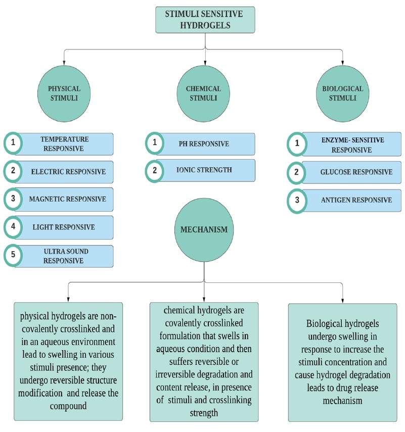 Smart hydrogels systems with various chemically and structurally responsive moieties exhibit responsiveness to external stimuli, including physical, chemical, and biological stimuli. The Physical stimuli responses include temperature, light, magnetic fields, electrical fields, and ultrasounds. Chemical stimuli responses pH, ionic concentration sensitive hydrogels and the biological stimuli responses; glucose, antigens, and enzymes sensitive hydrogels. Intelligent polymeric hydrogels change their structural and extent phase transition response to external stimuli resulting in clinical observations and advanced technology [6].