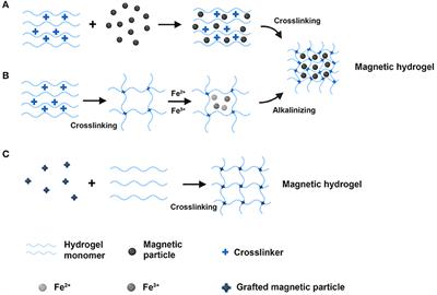 Fig. 4: The schematic diagram of the main three routes for the synthesis of the magnetic hydrogels. (A) The blending method. (B) The in situ precipitation method. (C) The grafting-onto method [42]