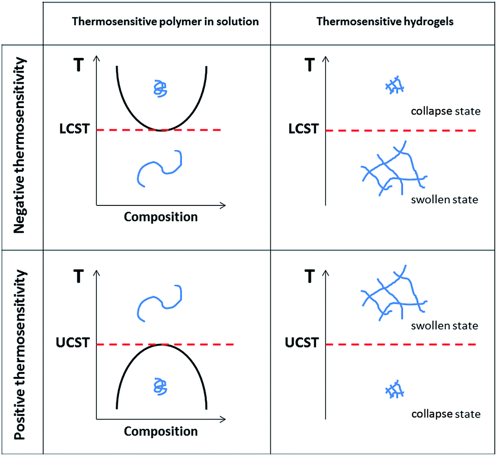 The characteristic feature of thermoresponsive polymers is the presence of hydrophobic units such as methyl, ethyl, and propyl groups. Critical solution temperature is a key parameter in temperature-sensitive polymers. At a specific temperature, the polymer phase changes according to its composition. If the polymer solution has a lower critical solution temperature (LCST), its solubility in water decreases upon heating. Otherwise, it is called an upper critical solution temperature (UCST). For the case of hydrogels, the solubility decreases, and hydrogels shrink as temperature increases above the LCST [24, 25].