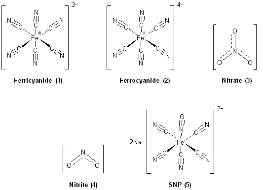 Fig. 1: Chemical structures of ferricyanide, ferrocyanide, nitrate, nitrite and SNP
