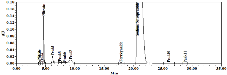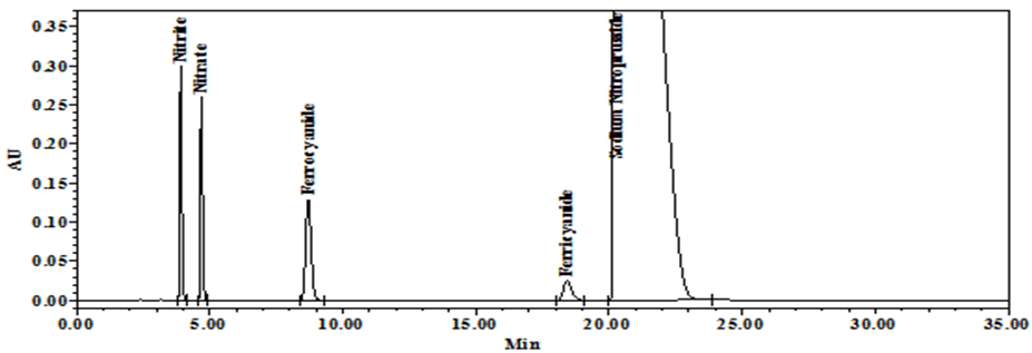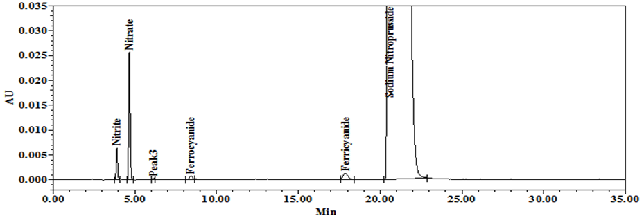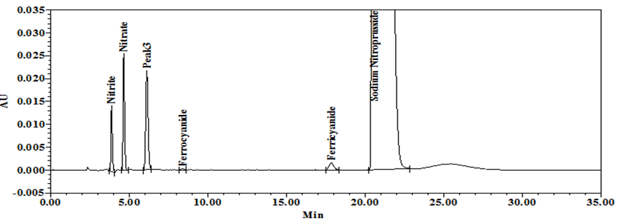 Standard-1 contains 10 µg/ml of each nitrite, nitrate, ferrocyanide and SNP and Standard-2 contains 10 µg/ml of ferricyanide. Chromatograms of both standards were given in fig. 2 and 3.
