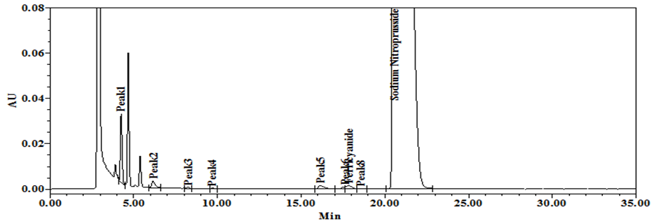 The finalized related substances method was capable of quantifying all known and other possible degradation impurities in SNP injection formulation. As a part of the system suitability, two different standard solutions are adopted to find the exact areas of ferrocyanide and ferricyanide.