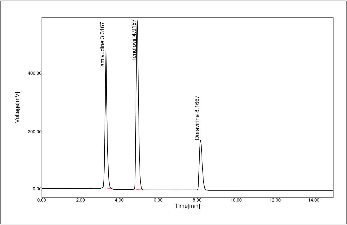 The values of tailing factor, peak areas, theoretical plates and resolution for DRV, TFF and LMV peaks obtained with the optimized assay conditions were displayed in table 1 and a typical chromatogram of DRV, TFF and LMV combination was furnished in fig. 1.