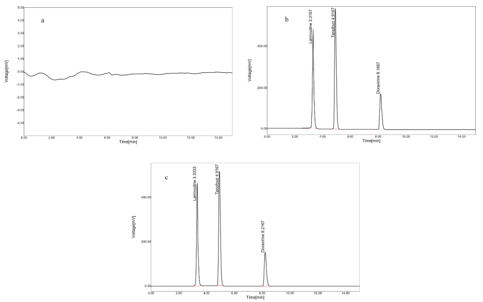 Specificity was demonstrated by assessing the chromatograms attained with the analysis of working combination solution (DRV-100 µg/ml, TFF-300 µg/ml, LMV-300 µg/ml), blank diluent solvent system and working tablet solution (DRV-100 µg/ml, TFF-300 µg/ml, LMV-300 µg/ml). Fig. 2 shows the representative chromatograms. No peaks were identified in the chromatogram (fig. 2a) of the blank diluent solvent system. The retention times of LMV, TFF and DRV in the chromatogram (fig. 2c) of working tablet solution was confirmed with retention times of LMV, TFF and DRV in the chromatogram (fig. 2b) of working combination solution. Additional peaks other than LMV, TFF and DRV peaks were not identified in the chromatogram (fig. 2c) of working tablet solution.