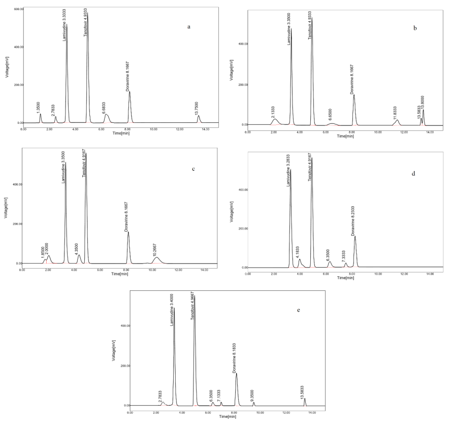 The resolution of LMV, TFF, DRV and its degradation components, as shown in chromatograms (fig. 3a-e) of degraded tablet sample solutions, showed stability, indicating characteristic feature and specificity of assay method for the LMV, TFF and DRV combined analysis.