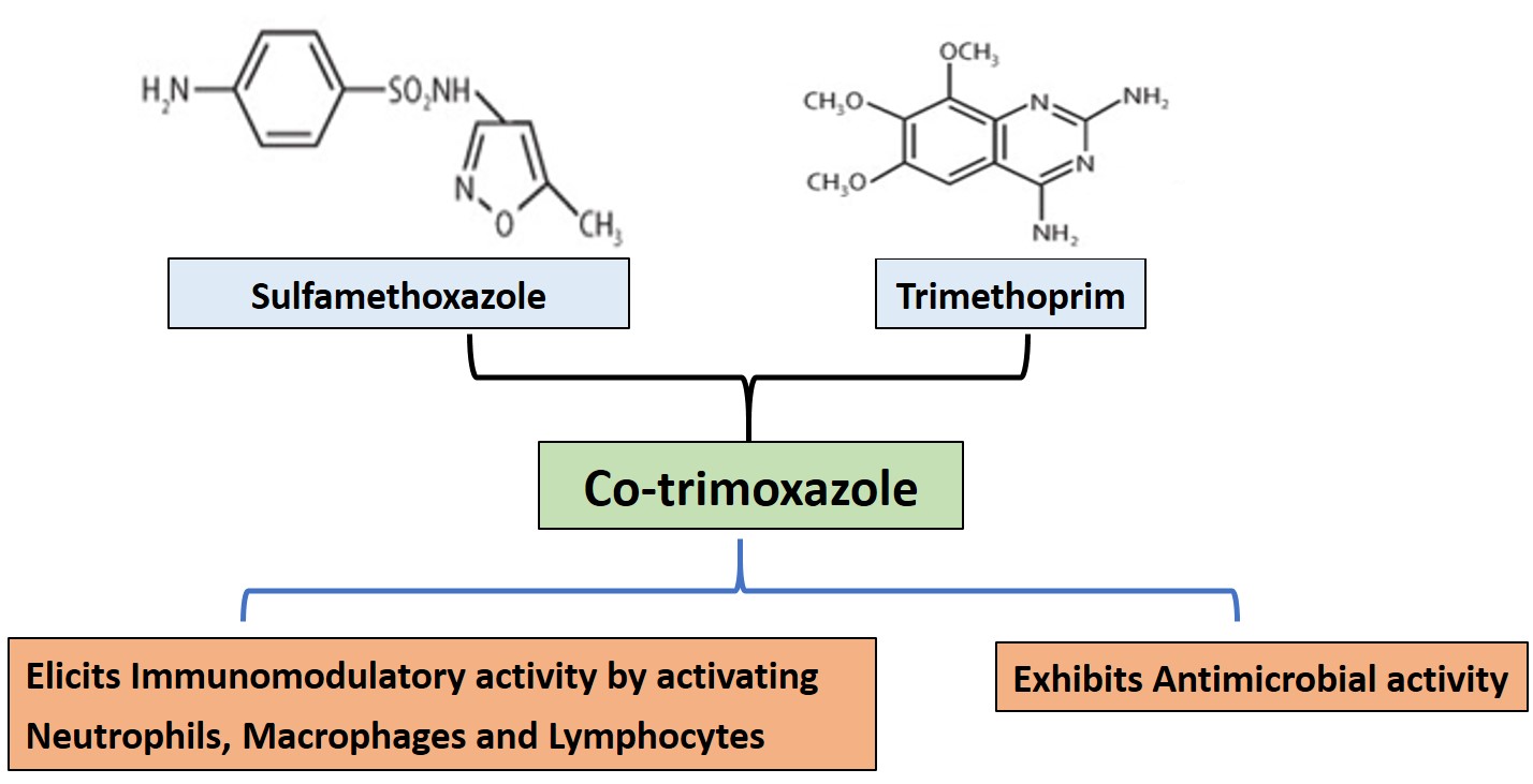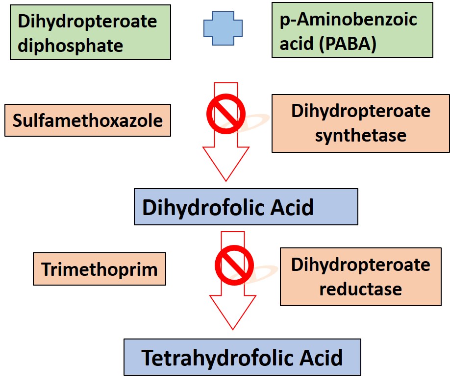 Both TMP as well as the SMX exhibit better result upon combination compared to when they are administered separately since it inhibits successive steps that folate synthesis way. It is done by challenging with p-aminobenzoic acid (PABA) in the biosynthesis of dihydrofolate. TMP helps as a competitive inhibitor of dihydrofolate reductase [7-8].