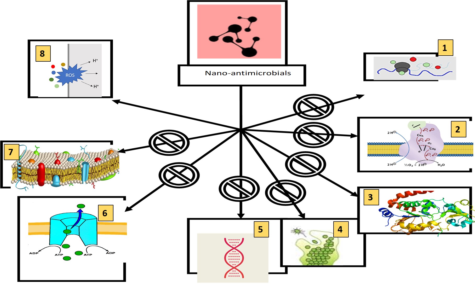Fig. 3: Nano anti-microbials and their different mode of actions, (1-Attachment to 30s ribosome subunits; 2-Damage/disruption of proton pumps; 3-Protein damage; 4-Prevention of Biofilm formation; 5-DNA damage; 6-Disruption of electron transport chain; 7-Disruption of microbial cell membrane; 8* Generation of ROS) [23]