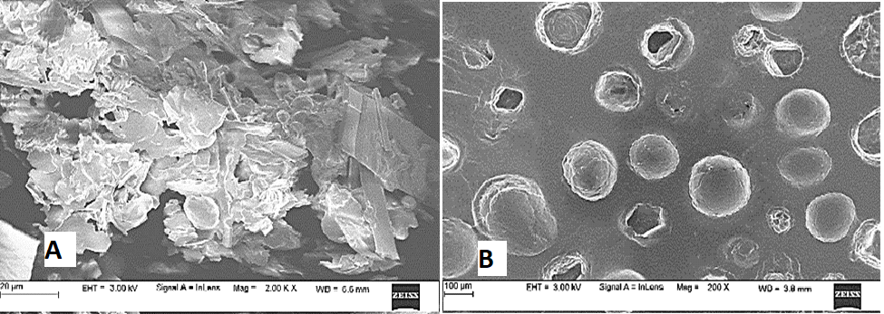 Fig. 1: A) SEM of proniosomes before hydration B) SEM of proniosomes after hydration