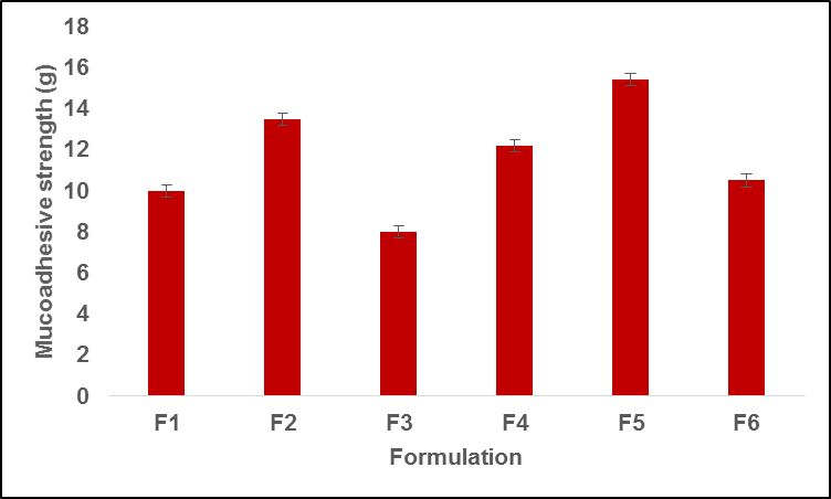 Fig. 3: Comparison of ex vivo mucoadhesive strength of all formulations