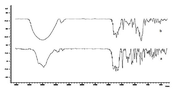 Fig. 1: Overlain FT-IR spectra of a. pure drug (Doxycycline hydrochloride) b. Physical mixture of formulation DT8