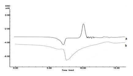 Fig. 2: DSC thermograms of a. Pure drug (Doxycycline) b. Physical mixture of formulation DT8