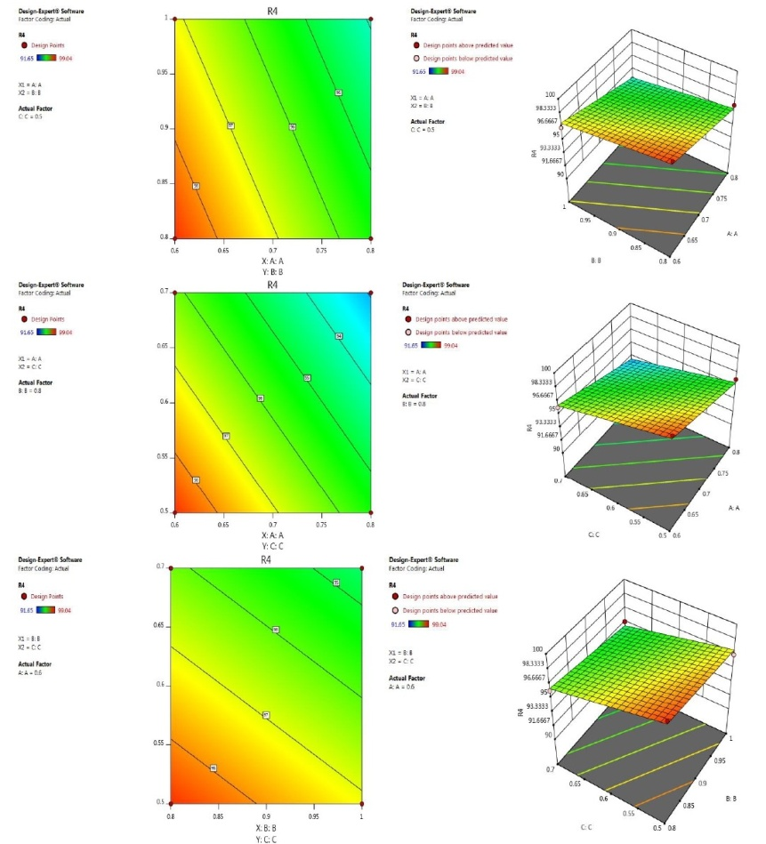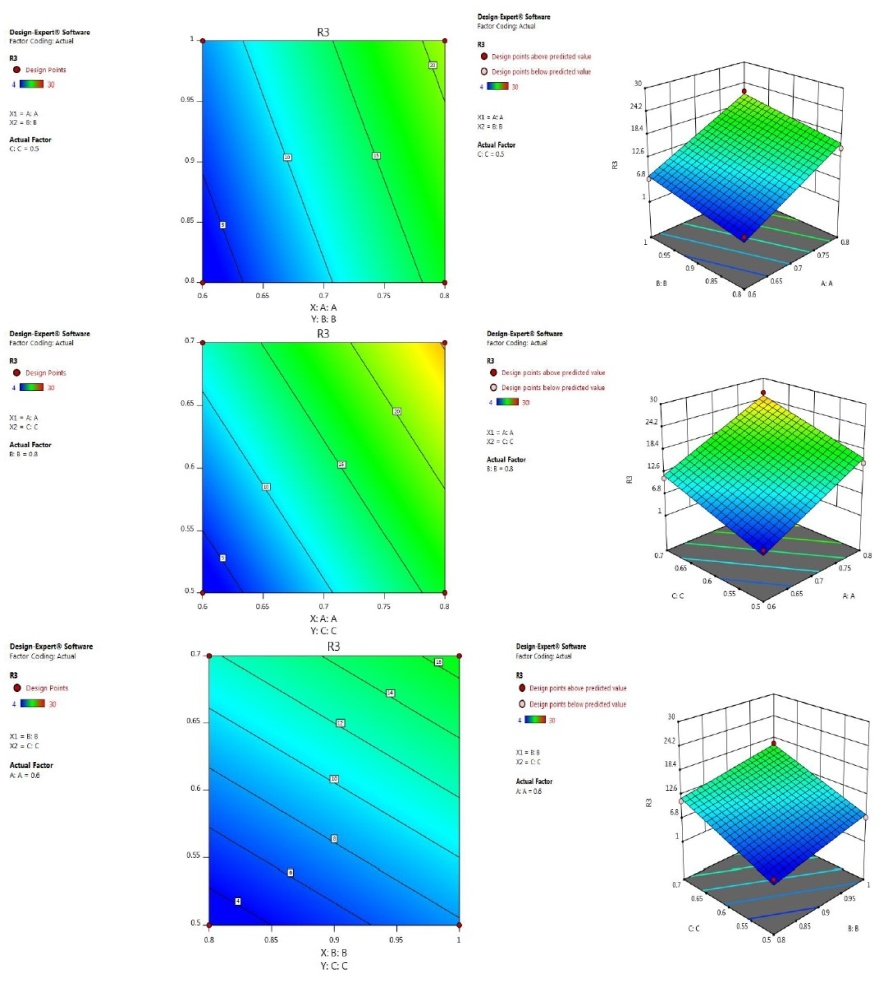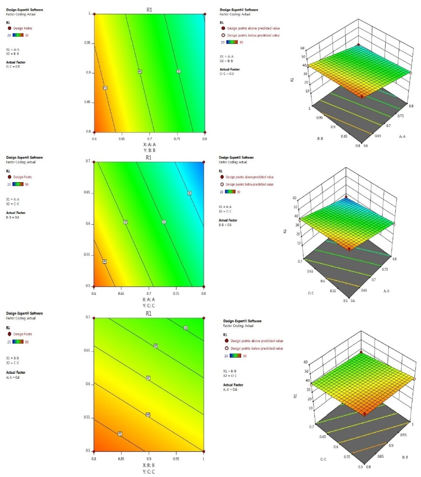 Based on 23 factorial designs, the separate response variables for gravitational flood stimulation (R3) led in distinct combinations of factors A and B. R3=-80.25+67.50*A+25.00*B+45.00*C was the equation extracted from the best response R2 fit to the independent variables. ANOVA showed that model F value-139.76, P<0.05 was important. Also, the 0.9622 r2 predicted was comparable to the 0.9835 r2 adjusted. It was observed that the gelation time was considerably affected by A and B variables. R3's three-dimensional (3D) reaction surface plot (fig. 5) showed a substantial reduction in the stimulation of gravitational flow with increased levels of variables A and C. This connection may be due to enhanced system viscosity at higher concentrations of A and C variables.