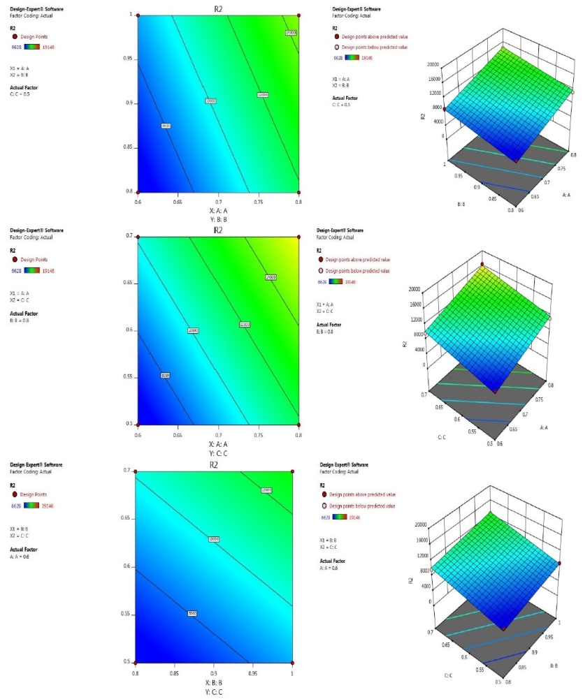 In the range, 6628 to 19146 cps, the viscosity values of all the formulation were found. R2 =-33187.75+ 29215.00* A+14007.50*B+20832.50*C was the equation extracted from the best suited mathematical model for R2 and the independent variables. ANOVA proposed model F value 98.66 and P value<0.05, showing that the model is significant. Also, the r2 0.9467 predicted is in fair competition with the r2 0.9767 adjusted. Viscosity has a major impact on GA, NaCl and TSP variables. 3 R2 plot Dimensional reaction (3D) is shown in (fig. 4) increased viscosity significantly with a rise in GA and NaCl variables.